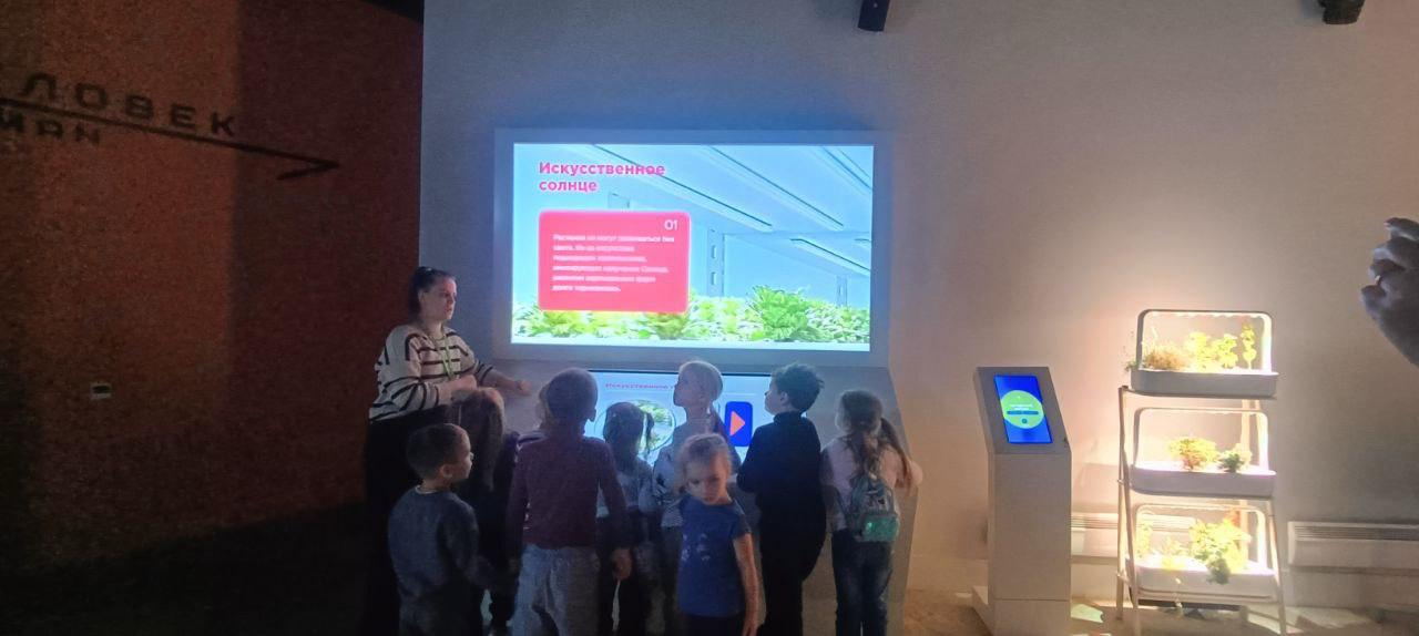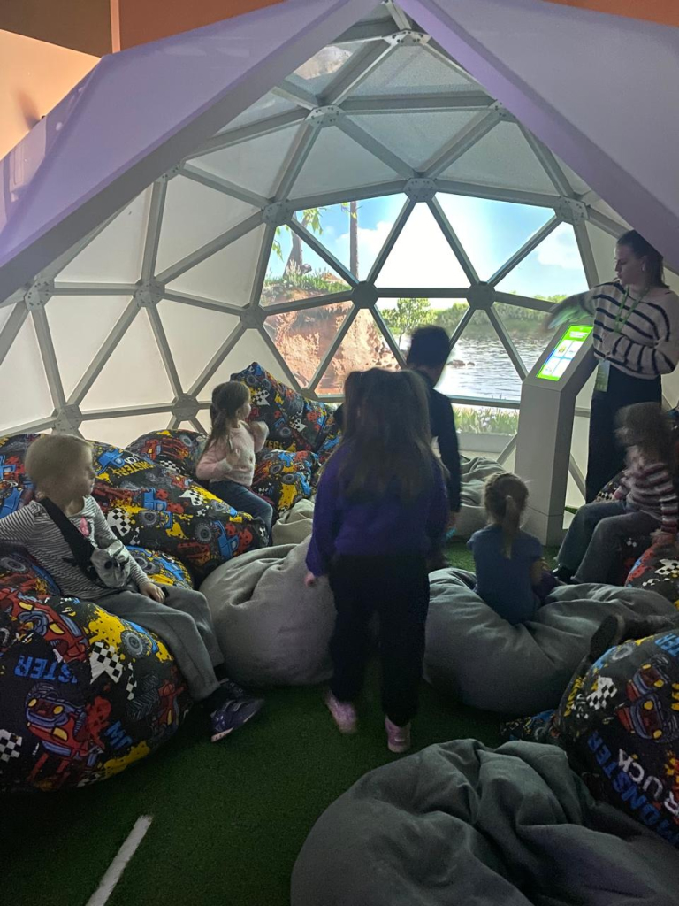 В ходе экскурсии ребят сопровождал гид и робот-гид Вертер. Дети узнали о профессиях, характерных для каждой из зон экоцентра. А потом всех ждали интерактивные экспонаты! Разместившись на креслах-мешках в необычном объекте в виде сферы, ребята совершили путешествие по красивейшим местам нашей большой страны - России.