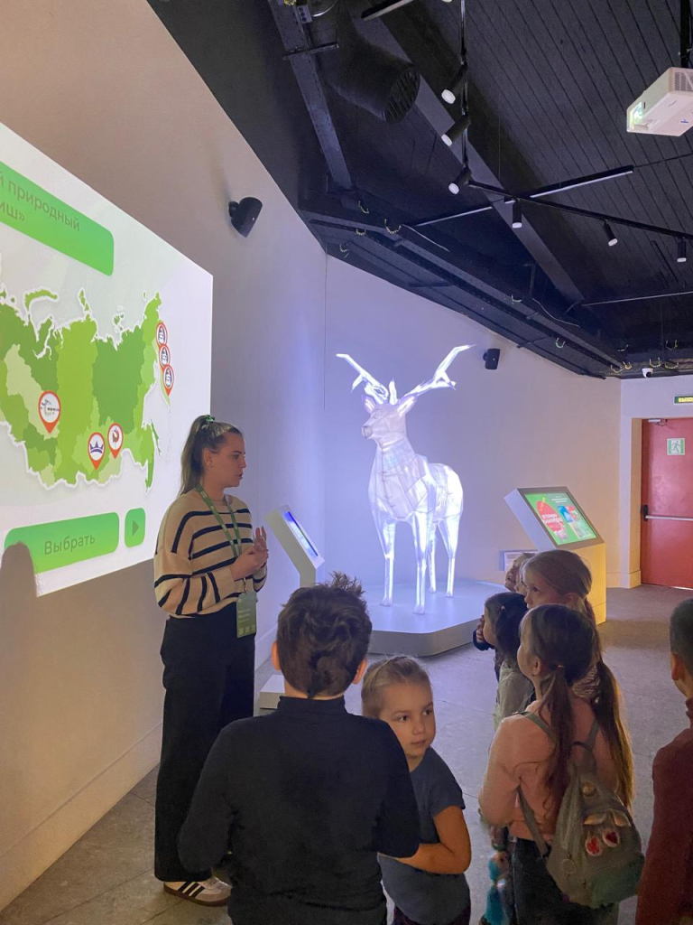Это современная экспозиция, посвященная профессиям будущего, связанным с экологией. Встреча прошла в интерактивном мультимедийном формате - "обучение через игру". Экспозиция экоцентра делится на пять тематических зон: «Природа», «Человек», «Город», «Экотехнологии», «Профлаборатории».